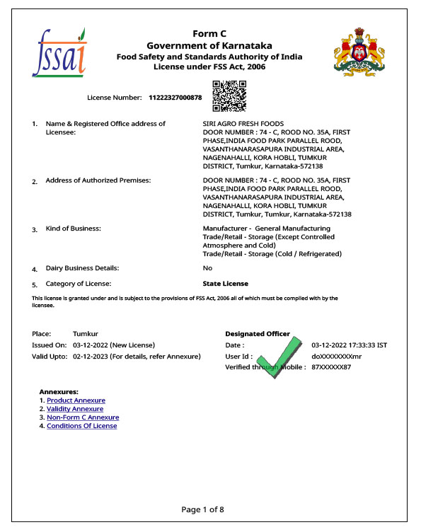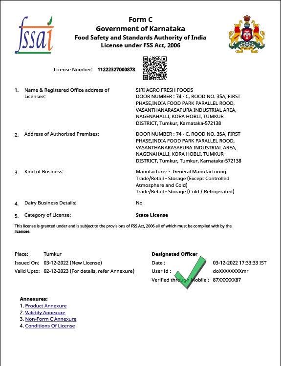Siri Agro strictly follows the quality standards through the process at each stage.Concentrationg on extending the shelf life of the product by improved method of packing and cross check with stability study of the product. Always try to meet standard requirement.